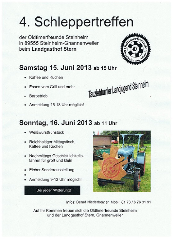 Hallo zusammen. dieses Jahr findet am 15. und 16. Juni wieder unser Oldtimer-Treffen in Steinheim/Gnannenweiler statt. Dieses Jahr mit Eicher-Sonderausstellung. Am Programm hat sich im großen und ganzen nichts geändert.